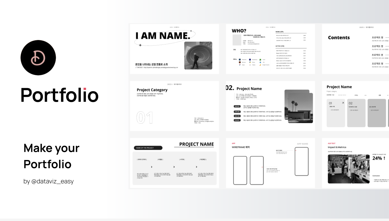 그래서 맞춤형 프로젝트에 맞게 구성할 수 있도록 [포트폴리오 템플릿 총 30 페이지 레이아웃] 을 직접 제작했는데요,