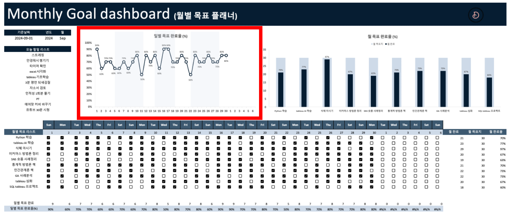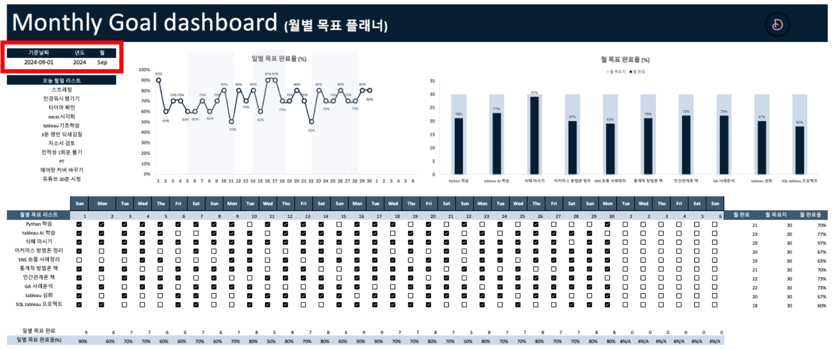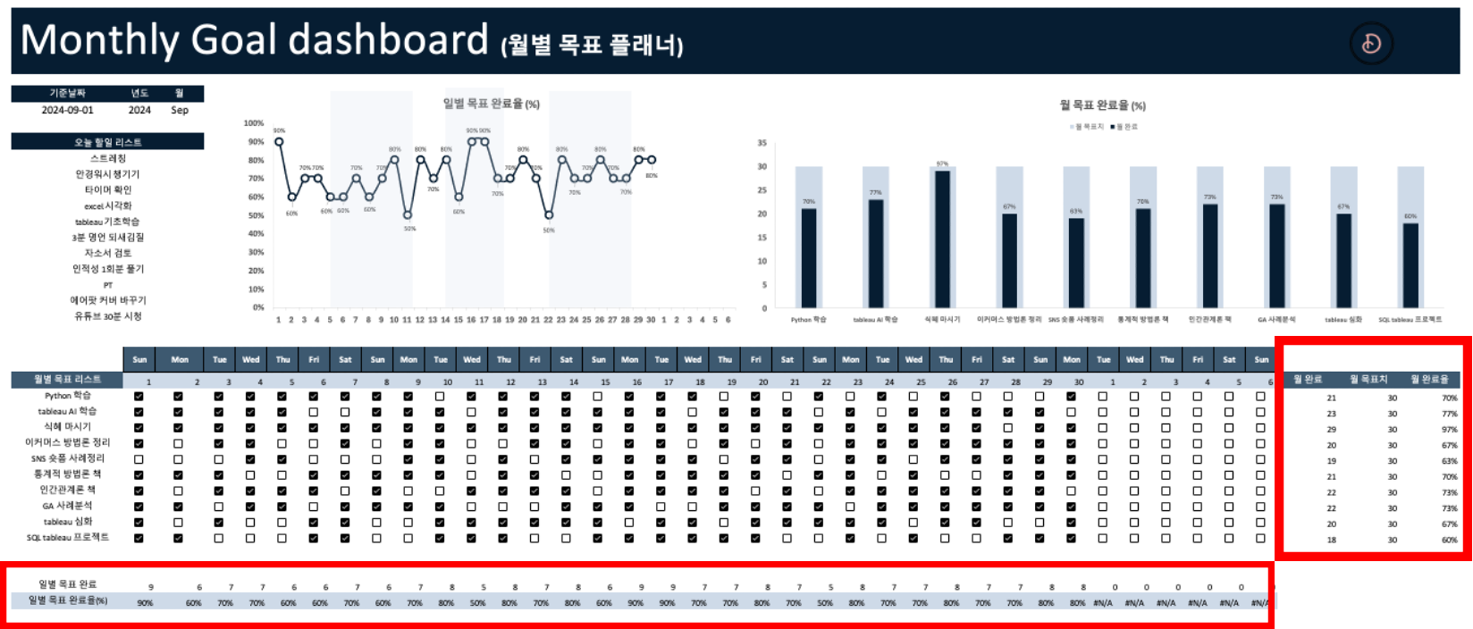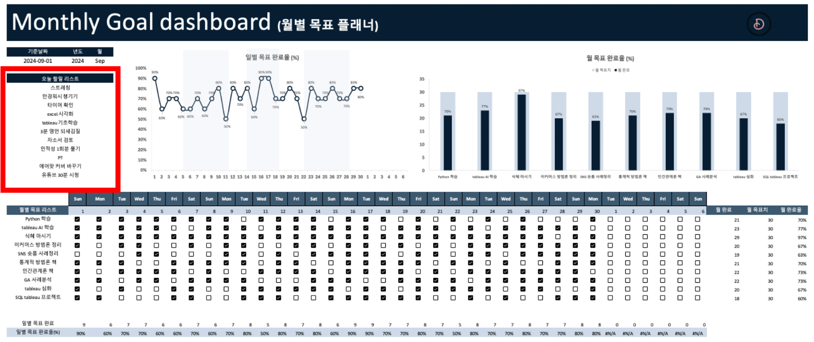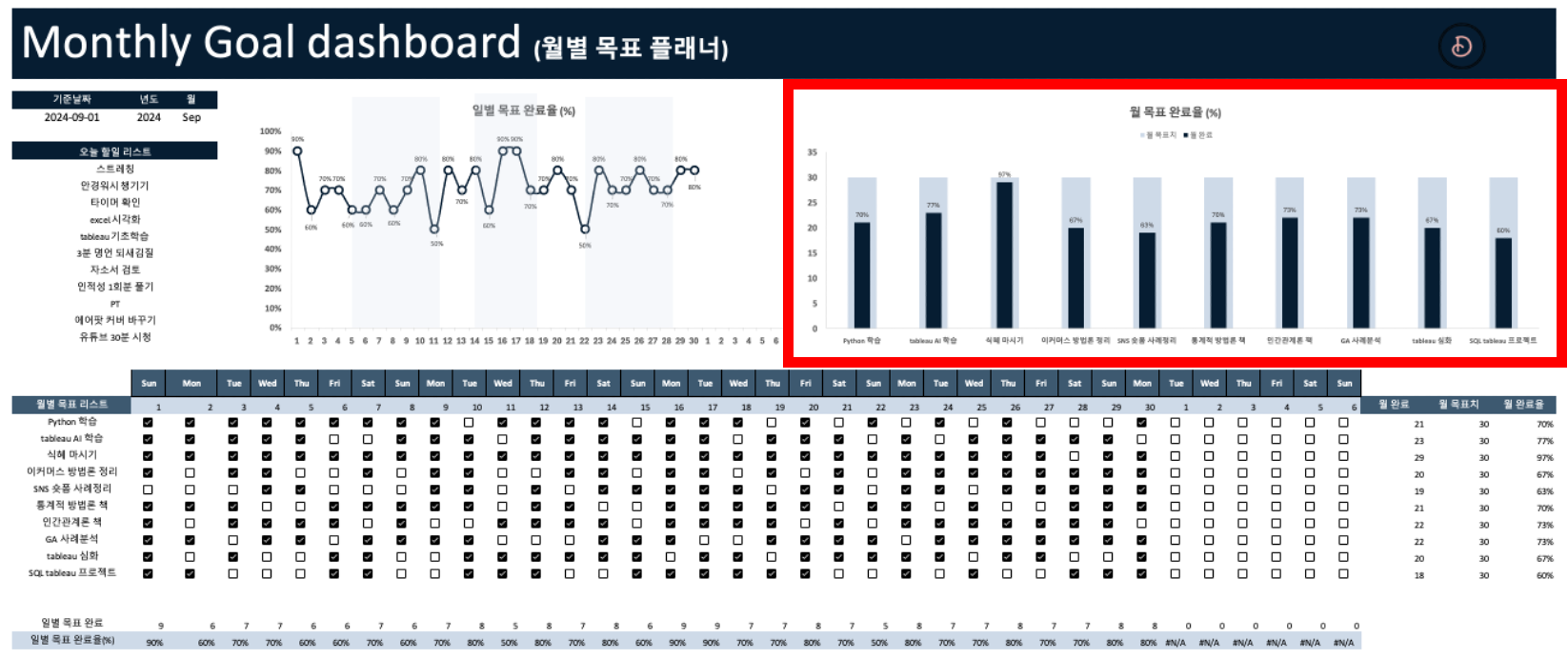 해야 할 일에 대해 체크만 하면 월별 목표가 얼마나 완료되었는지 자동으로 시각화 해주는 템플릿 어디 없을까?