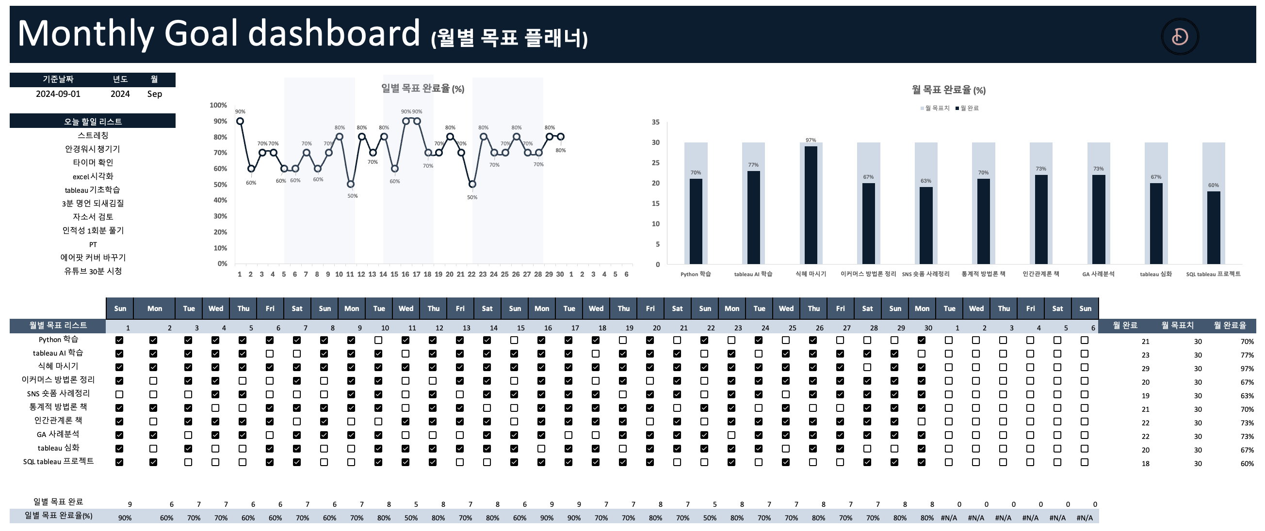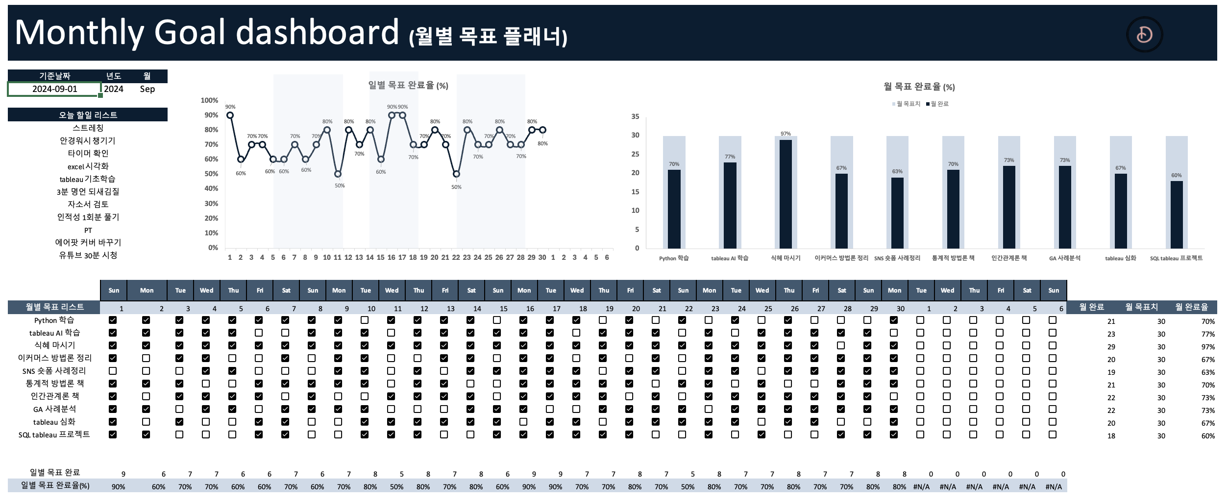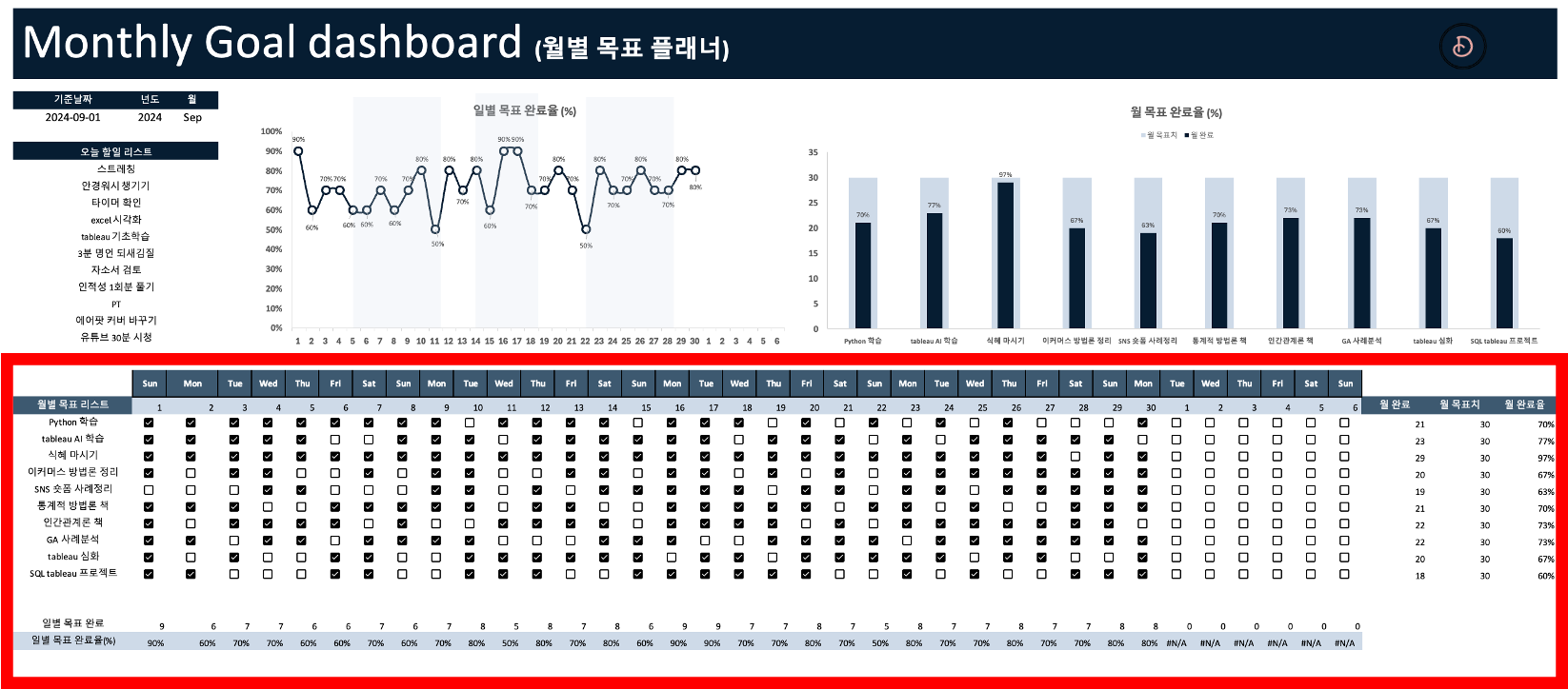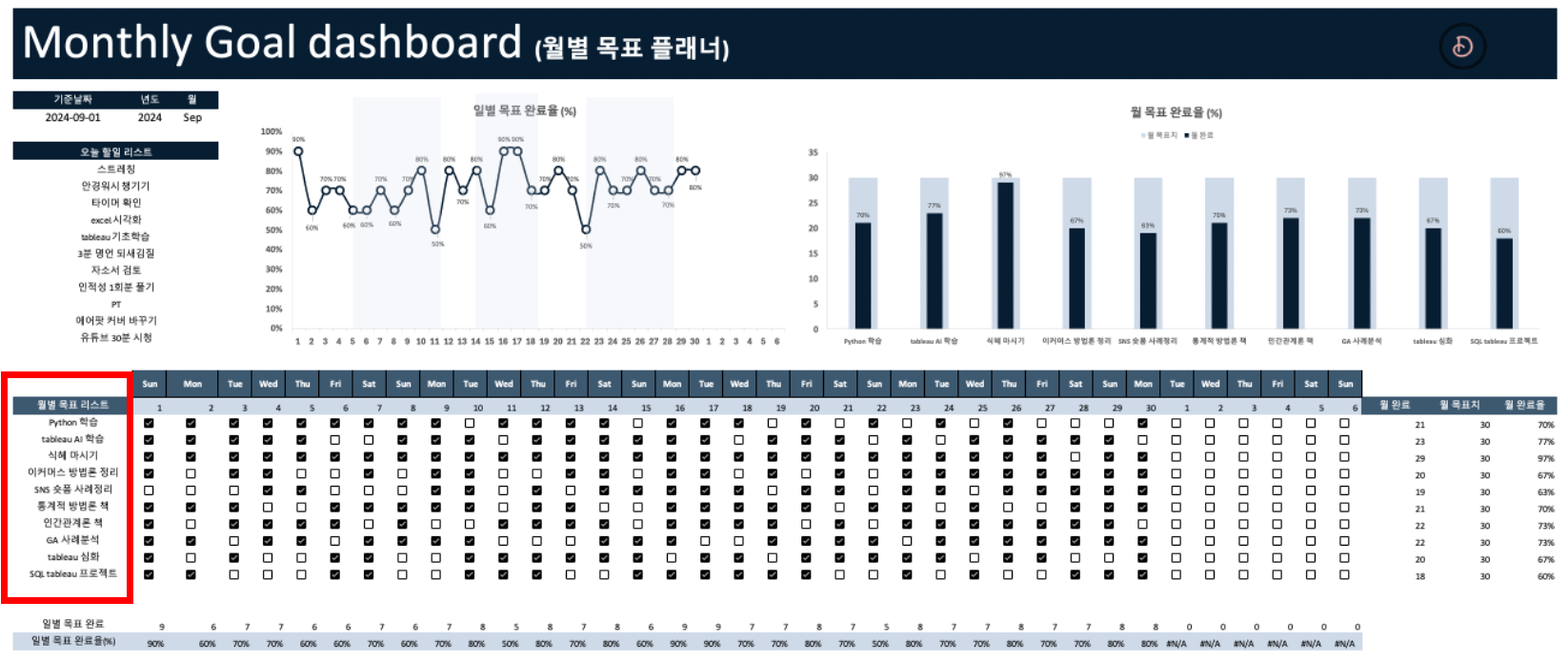 해야 할 일에 대해 체크만 하면 월별 목표가 얼마나 완료되었는지 자동으로 시각화 해주는 템플릿 어디 없을까?